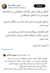 به گزارش مجله خبری تپور؛ چند سیاستمدار و فعال رسانه ای نسبت به توییت اخیر مهدی فضائلی، عضو دفتر حفظ و نشر آثار رهبر انقلاب درباره گشت ارشاد، واکنش نشان دادند. توییت های زیر از جمله این واکنش ها است.