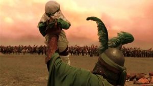 وقتی حسین(ع) ندای هل من ناصر سر میدهد و شهدای کربلا یک به یک به میدان رفته و ارباََ ارباََ میشوند، تنها یک نفر در خیمهها مانده … علی اصغر … وقتی فرزند ندای پدر را میشنود همچون حیدر در گهواره بند قنداق پاره میکند و خود را به پایین میاندازد، گریهاش گریه نیست، رجز مردی است که میخواهد به میدان برود، میخواهد ندای امام را لبیک بگوید.