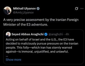 وزیر امور خارجه کشورمان نوشت: مسیر انتخابشده توسط اروپا، اگر مهار نشود، پیامدهای شدیدی برای اعتبار شورای امنیت سازمان ملل خواهد داشت. استفاده از سازوکار بهاصطلاح اسنپبک بدون رعایت روند قانونی یا مبنای حقوقی، نهتنها اعتماد به تصمیمات شورای امنیت را تضعیف میکند، بلکه صلح و امنیت بینالمللی را به خطر میاندازد. اکنون زمان آن فرا رسیده است که شورای امنیت—و جهان—گام پیش نهد و بگوید: “دیگر کافی است”.