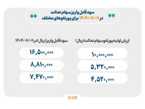 او با بیان این‌که مبلغ سود پرداختی به سهام‌داران عدالت به دلیل واریز سود سنوات قبل و یا سود متوفیان به وراث آنها متفاوت خواهد بود،گفت: دارندگان سبد سهام عدالت ۴۵۲ هزار تومانی مبلغ ۷۴۷ هزار تومان، ۵۳۲ هزار تومانی مبلغ ۸۸۱ هزار تومان و سبد سهام یک میلیون تومانی مبلغ یک میلیون و ۶۵۰ هزار تومان سود دریافت خواهند کرد.