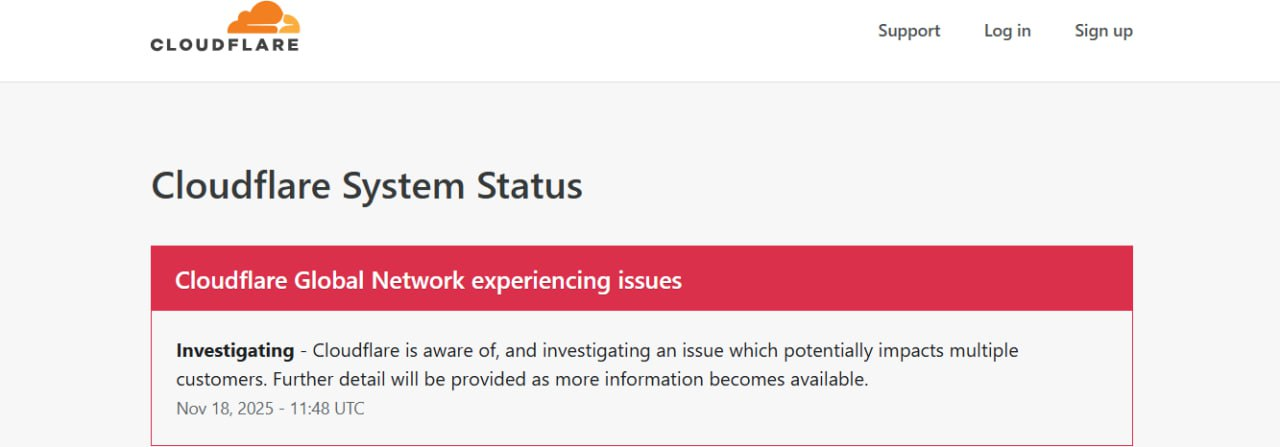 کاربران با پیام «خطای داخلی سرور در شبکه کلودفلر» و خطای ۵۰۰ مواجه شدند. کلودفلر که زیرساخت اینترنتی برای بخش وسیعی از وب فراهم می‌کند، مشکل را تأیید کرد و اعلام کرد داشبورد و API های خود نیز با اختلال مواجه شده‌اند.