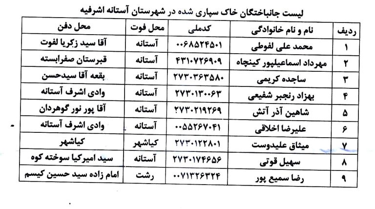 فرمانداری شهرستان آستانهاشرفیه در راستای سیاست شفافسازی دولت چهاردهم و با تأکید رئیسجمهور، پس از طی مراحل قانونی و با تأیید مراجع ذیصلاح، اسامی جانباختگان حوادث اخیر این شهرستان را با هدف پاسخگویی به افکار عمومی، صیانت از حقوق شهروندان و جلوگیری از انتشار اخبار نادرست بهصورت رسمی منتشر کرد.